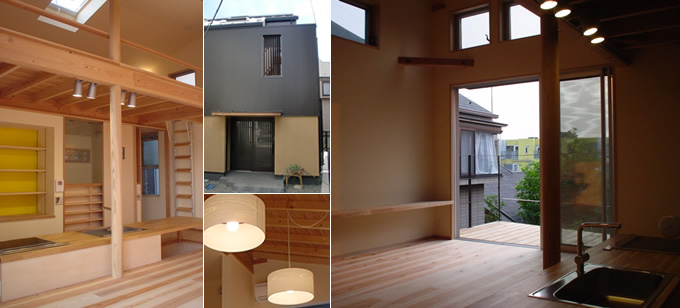 杉のフローリングや米松の梁など、木の香りも清々しい木造住宅です。採光を確保するのが難しい住宅密集地という立地から、1階は寝室、浴室、トイレ、日の当たる2階をリビングとキッチンに当てています。住居のほとんどの部分を既製品を使わず、手作業で造り上げました。